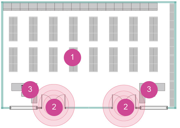 Each antenna emits a signal of up to 3.5m radius and this can be adjusted to suit your environment using a simple dial on the side of the antenna. If your exit is wider than 3m then simply add more antennas to expand the width. You just need to ensure the signal from each antenna overlaps.